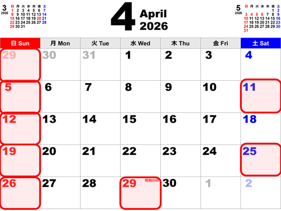 (カレンダーの赤枠が定休日となります。)